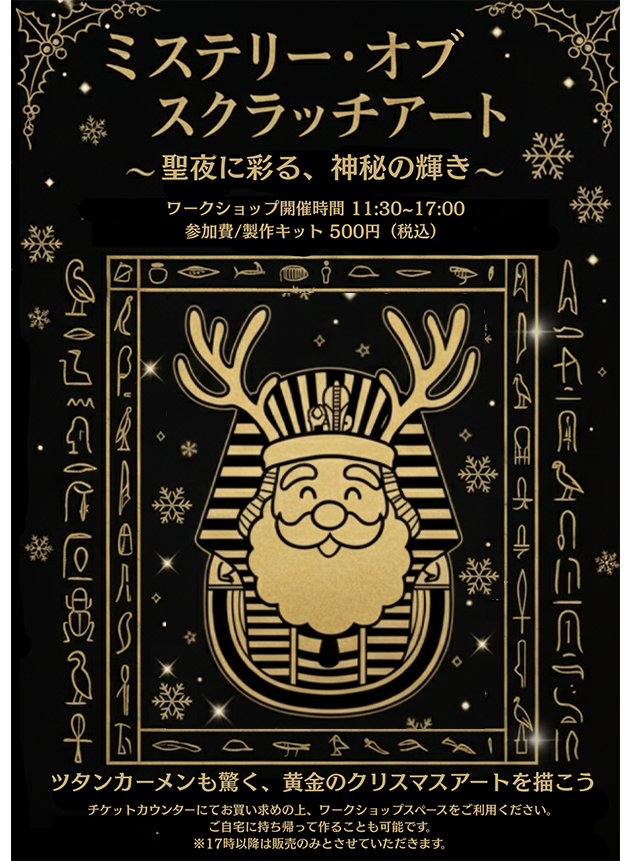 12月の平日限定で、スクラッチアートワークショップを開催します。クリスマスの装いをした神々やファラオを皆様の手で降臨させましょう!